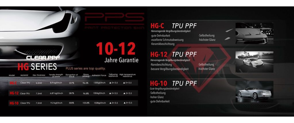 Alle PPS Paint Protection Skin Serien – HG-C, HG-12 und HG-10 – werden in Rollen à 15 Metern Länge und 152 cm Breite geliefert. Jede Rolle besteht aus einer hochwertigen, mehrlagigen TPU-Folie, die höchsten Lackschutz, brillante Optik und hervorragende Verarbeitungseigenschaften garantiert.
